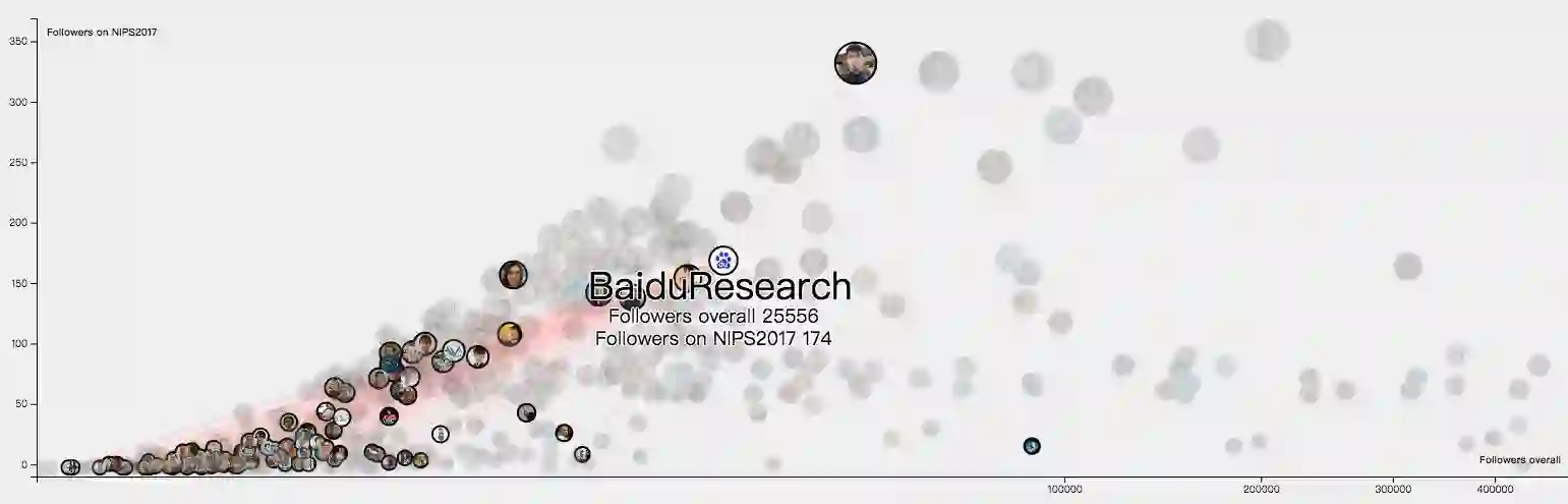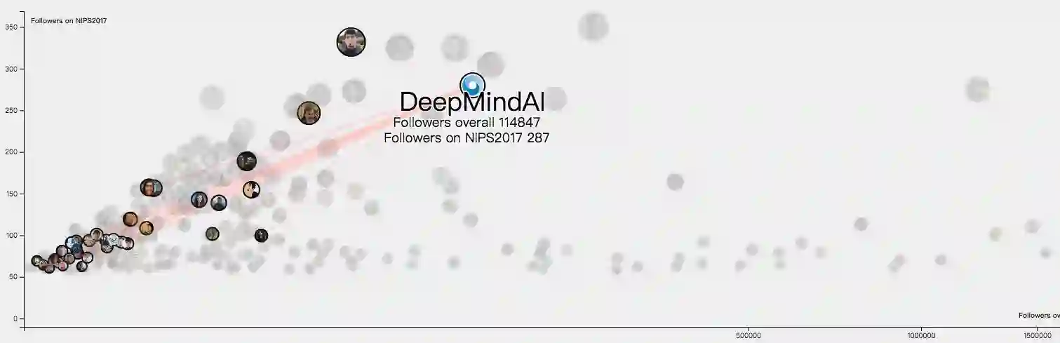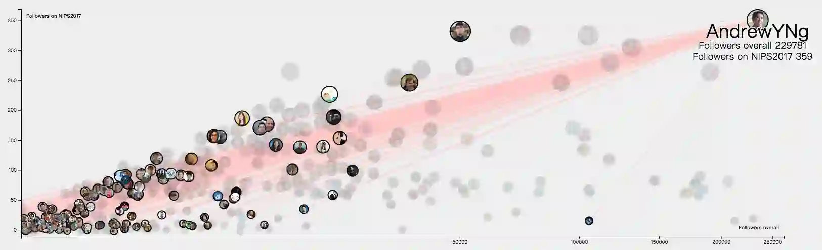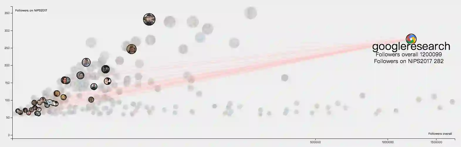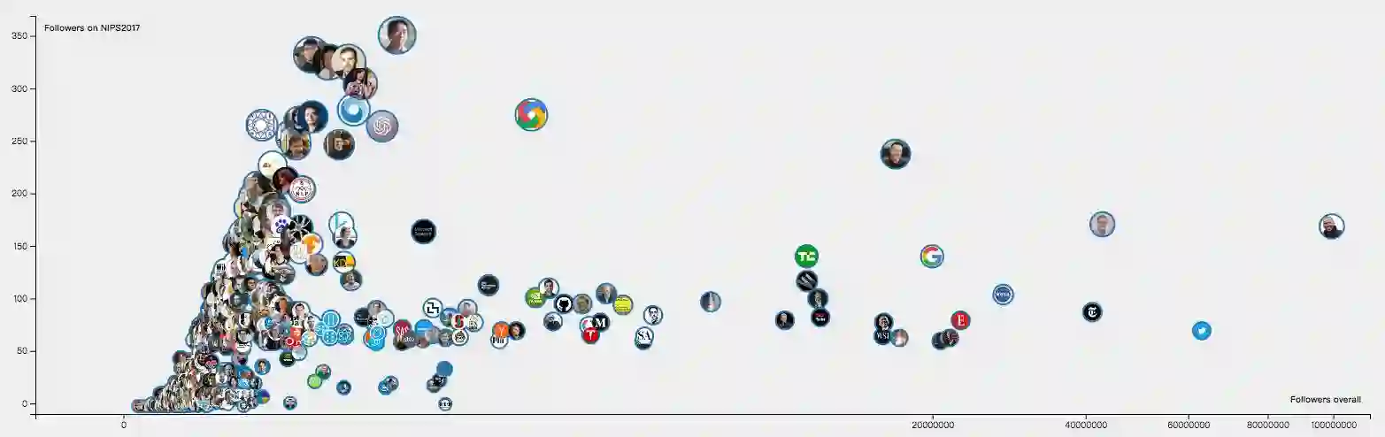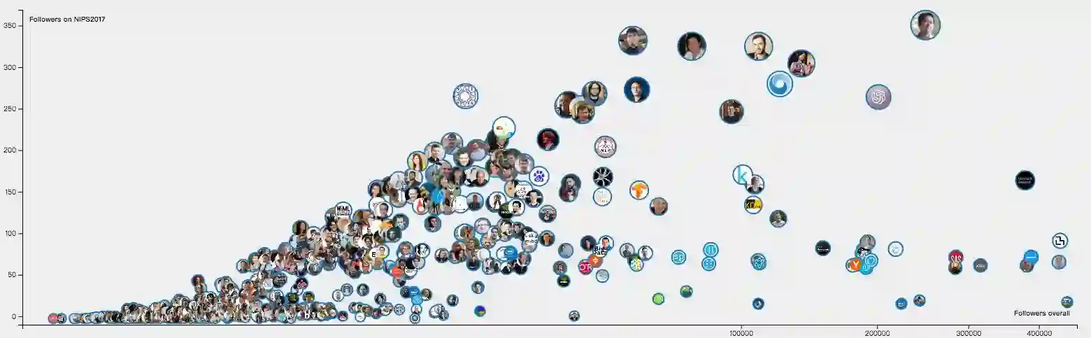 横轴表示Twitter账号的总粉丝数,纵轴表示参加了NIPS 2017的粉丝数
