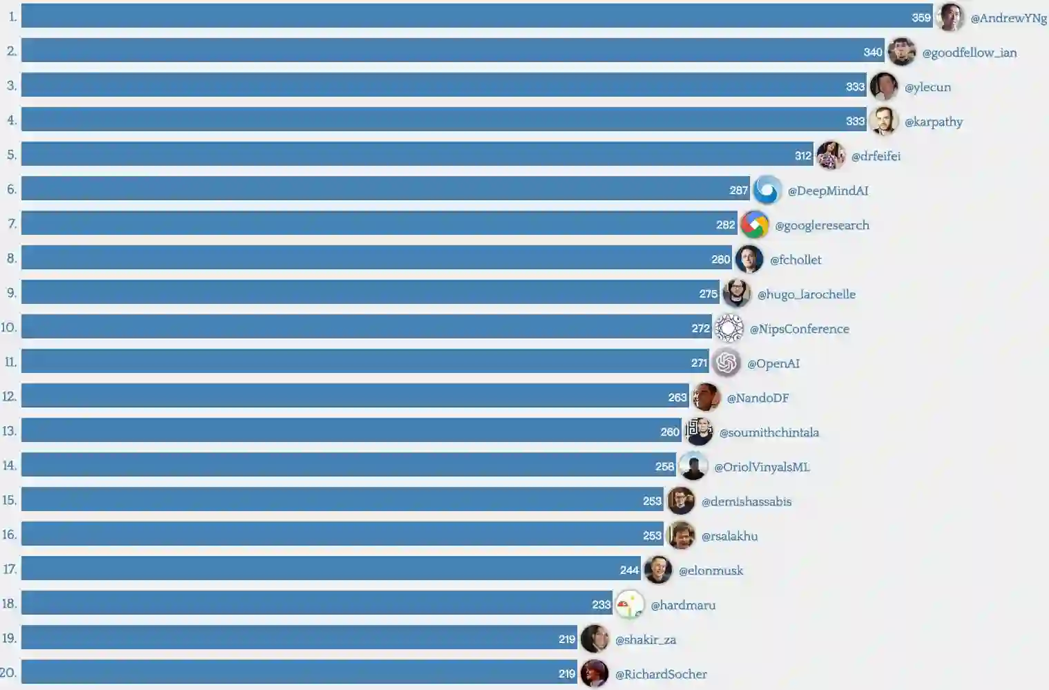 另外,排名第18位的@hardmaru是谷歌大脑的一名研究人员,论智曾与其合作,并编译了他的博文。可以看到,hardmaru同学的人气也不错呢。
