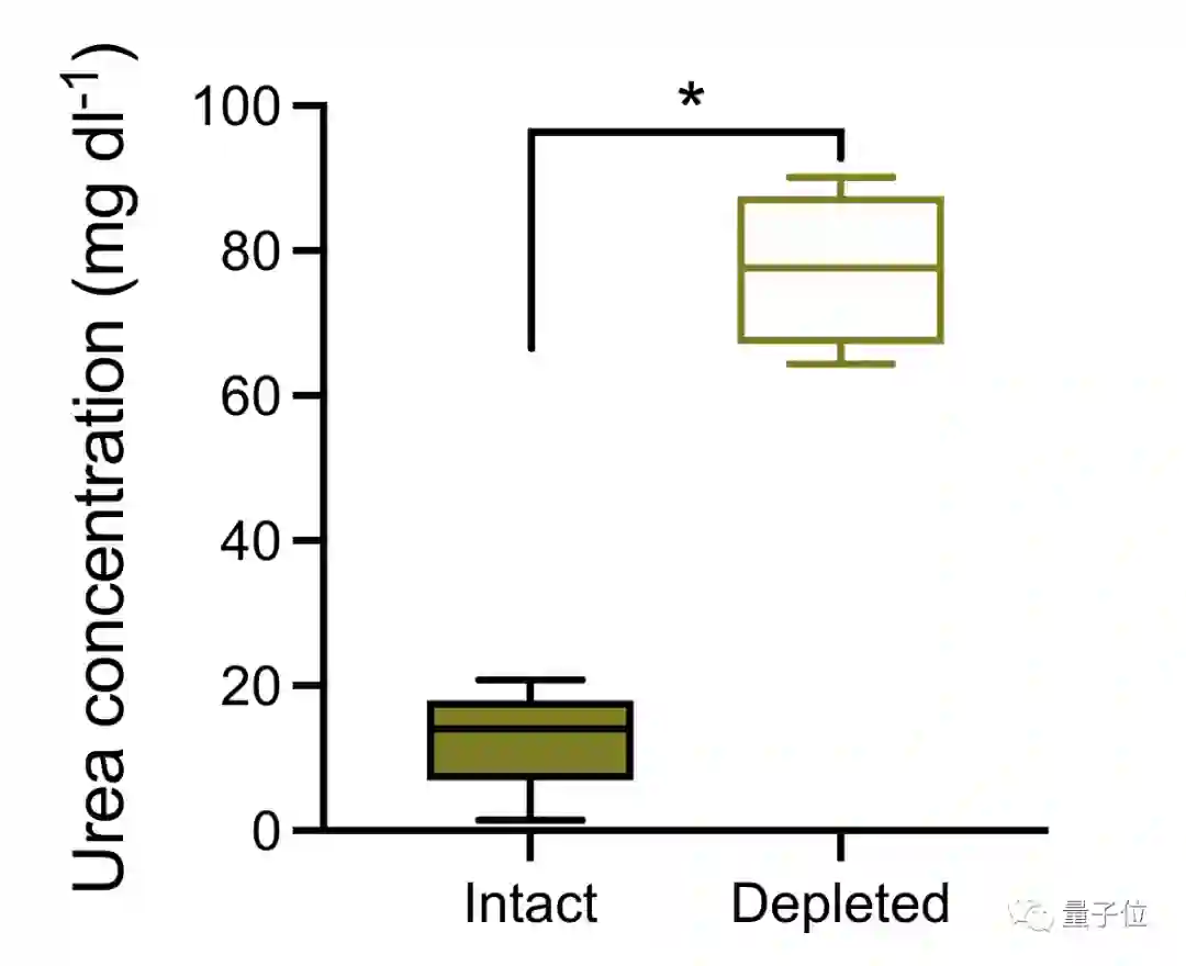 结果发现(下图纵轴代表尿素浓度),肠道微生物完整的一组(Intact)尿素浓度很低,而清除肠道微生物的一组(Depleted)尿素浓度很高。