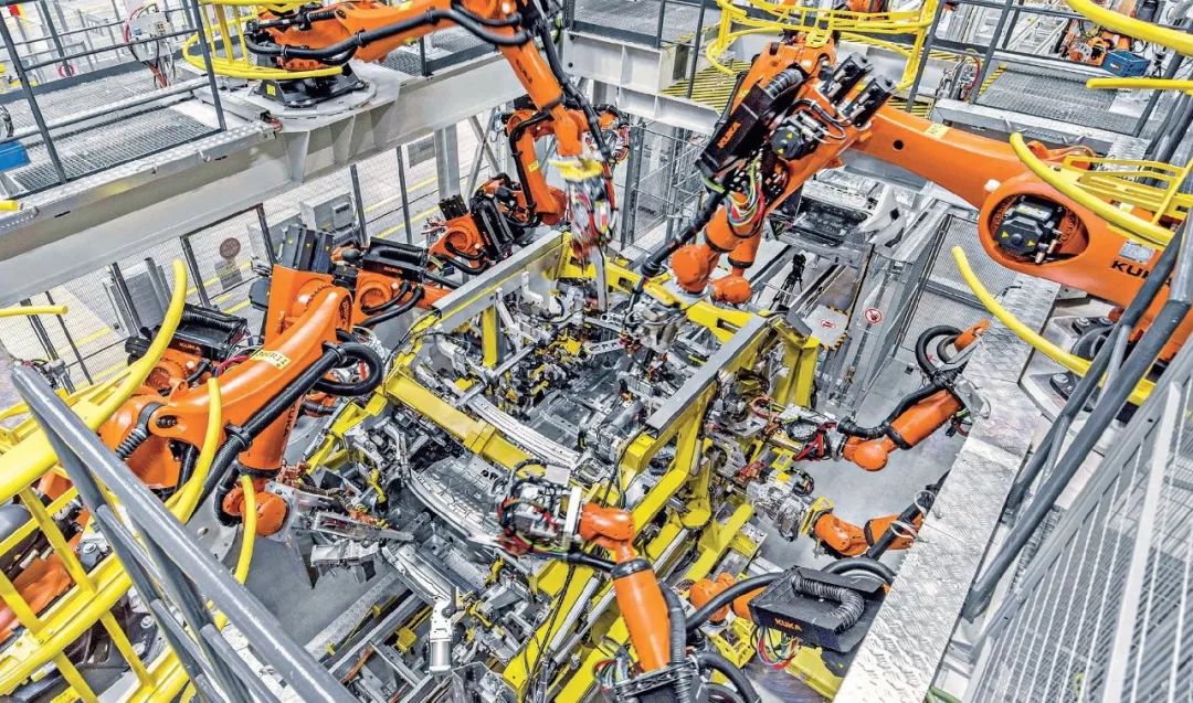 华晨宝马汽车有限公司新大东工厂车身车间,机械手臂在进行车身制造(新华社发)