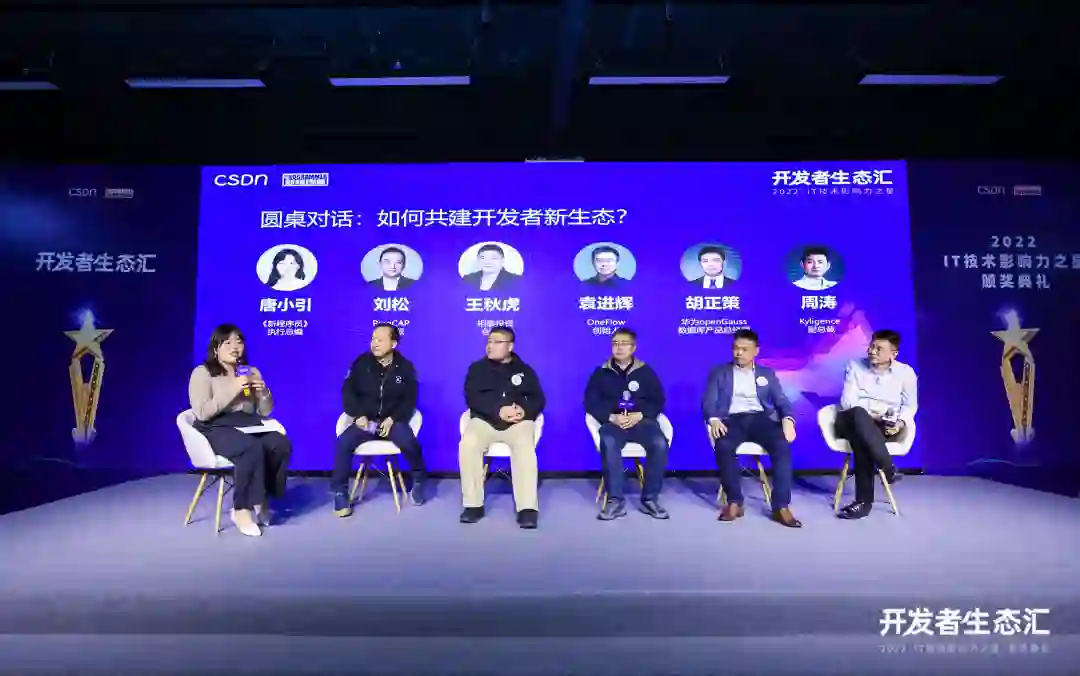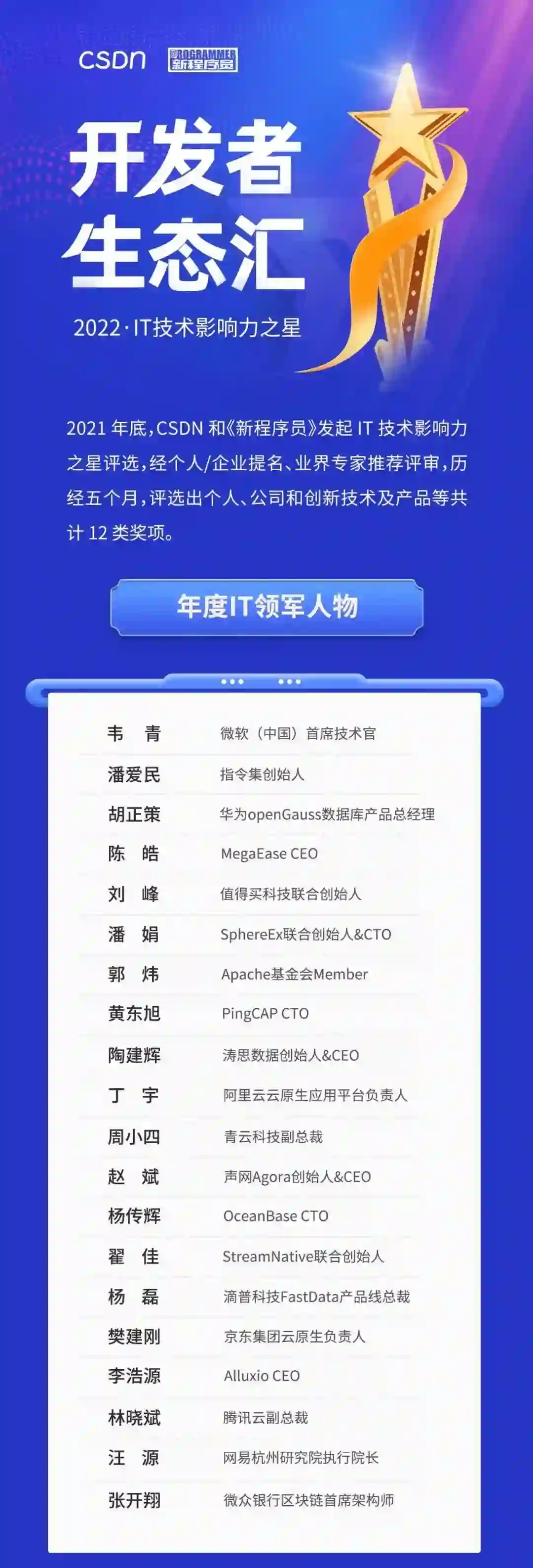3 月 30 日,由 CSDN 和《新程序员》特别举办“开发者生态汇 —— 2022 IT 技术影响力之星”活动隆重举行,邀请了 CSDN 创始人&董事长、极客帮创投创始合伙人蒋涛,指令集创始人兼董事长潘爱民,微软(中国)CTO 韦青,中国开源软件推进联盟副主席刘澎,MegaEase CEO 陈皓,PingCAP 副总裁刘松,华为 openGauss 数据库产品总经理胡正策,中国电子技术标准化研究院研究室主任杨丽蕴,相泰投资创始合伙人、开物投资共同创始合伙人王秋虎,OneFlow 创始人袁进辉,Kyligence 副总裁周涛,CSDN 副总裁邹欣等嘉宾,围绕开源开放、新兴技术,共论开发者新生态构建之道。