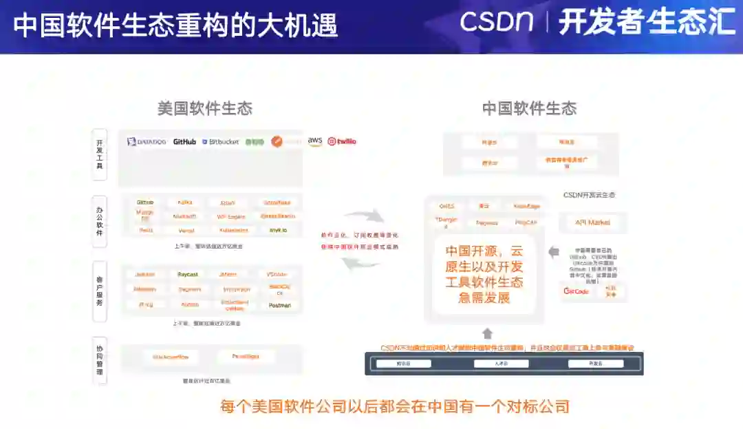 因此,在全球化生态发展的今天,中国数字经济想要领先全球,必须成为开源创造强国。这使得中国软件生态重构必须打造自己的技术生态。