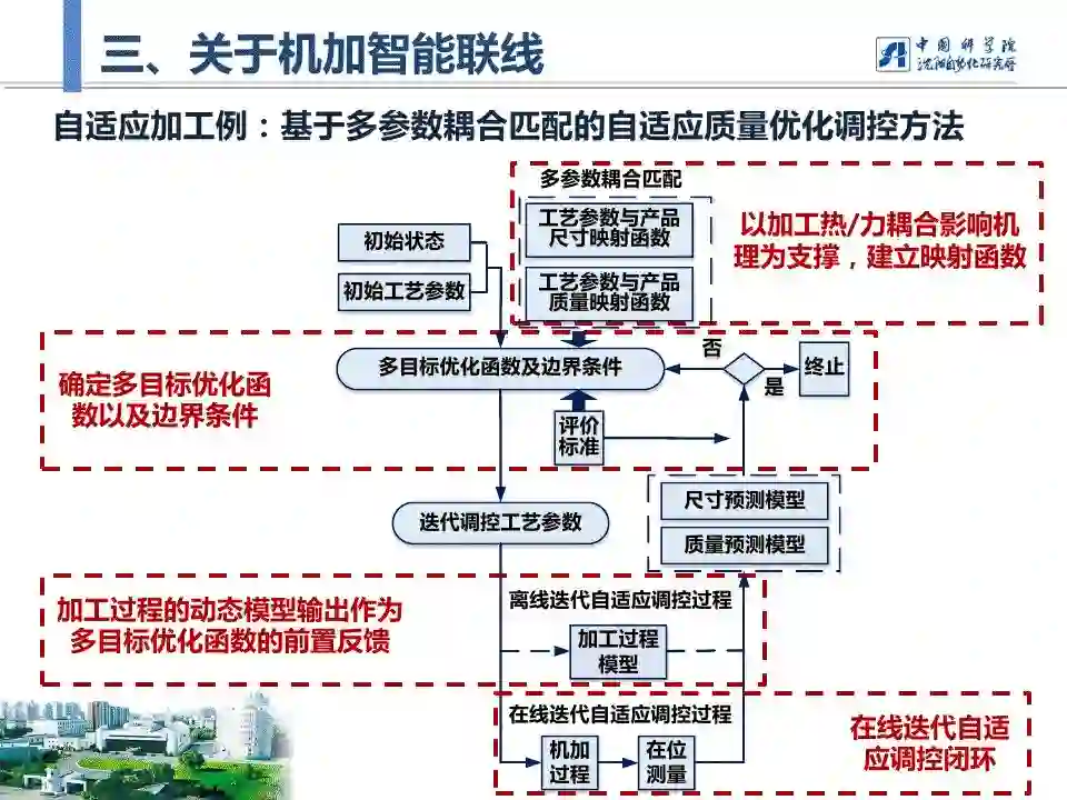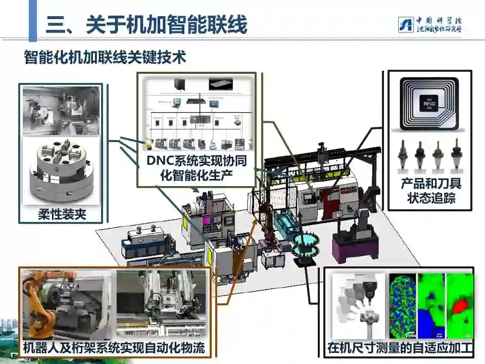 同时,他还介绍了智能化机加联线,智能化机加联线是智能制造重要部分,涉及的关键技术包括通过机器人及桁架系统实现自动化物流、基于快换夹具系统实现柔性装夹、基于RFID技术实现线上产品和刀具状态追踪、基于在机尺寸测量技术实现产品自适应加工,通过DNC系统的工艺文件管理、NC程序、刀具管理模块实现数据加工设备间的协同化智能化生产。
