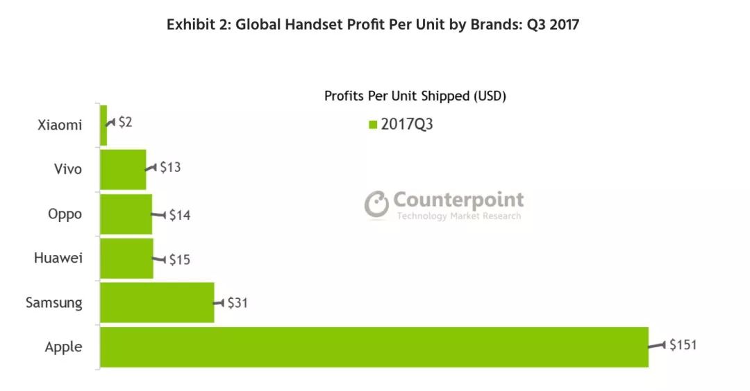 从上图中我们可见,苹果单机的利润是151美元,折合人民币980元。而小米的单机利润竟然只有2美元,也就13块钱。