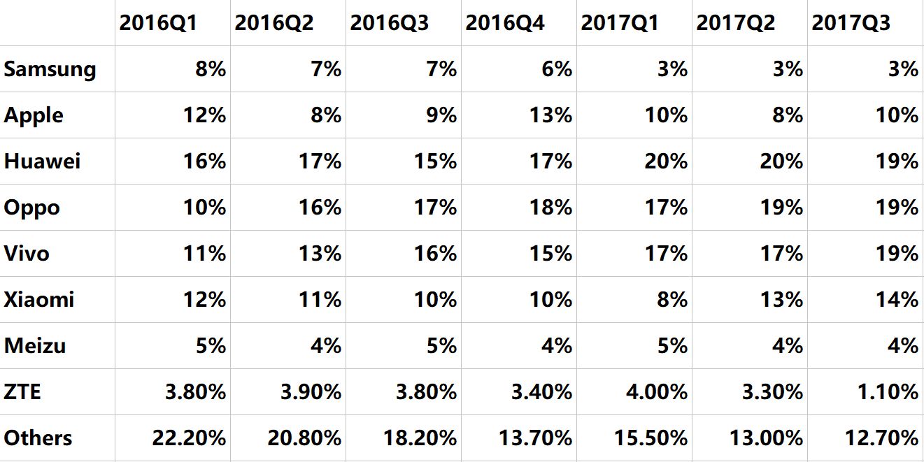 整个2016到2017第三季度,国内的手机竞争十分激烈。从下图我们能看出,蓝绿大厂占据了近40%的国内市场,华为小米占据了30%,剩下的才由其它厂商分。三星竟然可怜到只有不到3%的份额,看来爆炸事件影响还是巨大的。