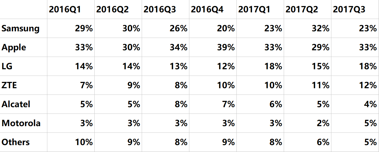可以看出从2016第一季度到2017第三季度为止,中兴是唯一成功打入美国市场的中国品牌。