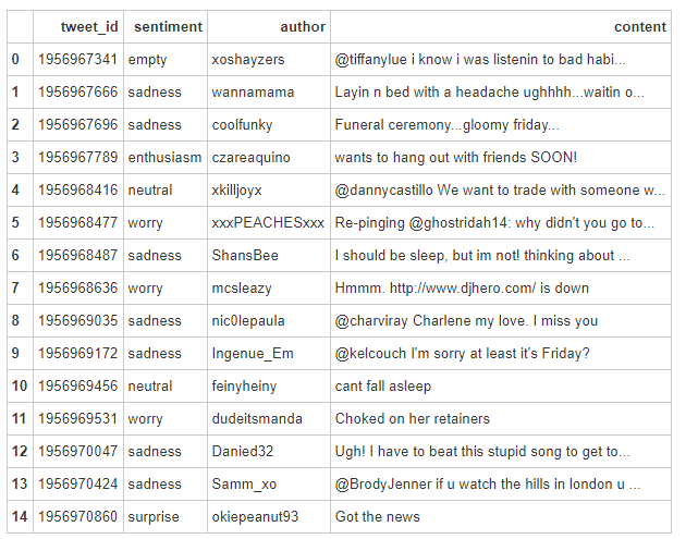 figure8_df = pd.read_csv("text_emotion.csv")figure8_df.head(15)