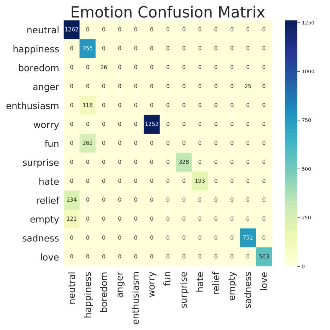 这些结果出乎意料的好,所以我看了一下困惑矩阵,似乎“热情(enthusiasm)”和“快乐 (fun)”都被归类为“幸福(happiness)”,这一点我百分百没问题。看起来真正有问题的孩子是“空虚(empty)”和“超脱(relief )”,但如果我说实话,我甚至不知道这些情绪是什么🤷♂,所以我要把这个标记为成功~