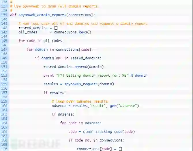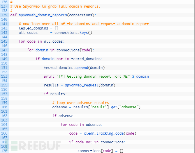 第145-155行:循环遍历所有的代码(145行),然后循环遍历与该代码关联的每个域名(147行)。如果我们还没有检查此域名(149行),就将域名添加到测试列表(151行),然后我们向Spyonweb发送请求以获取当前域名的域名报告(155)。