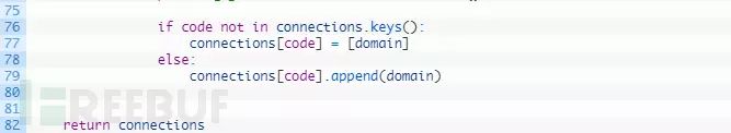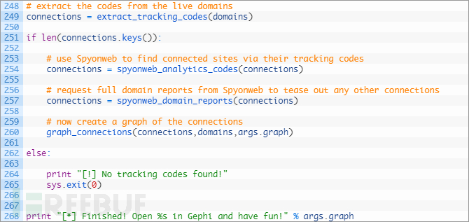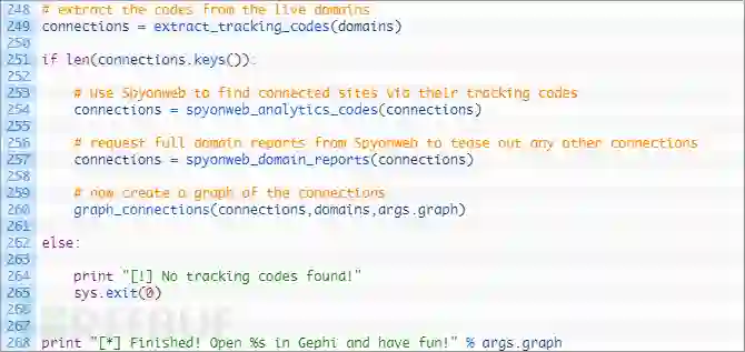 第67-69行:我们遍历提取代码的列表(67行),然后将其通过clean_tracking_code函数将其传递到清理和规范代码部分,接下来测试我们是否已经有了这个代码(72行),如果没有,就将其添加到连接字典中,然后我们就可以对目标域名进行追踪了。