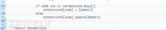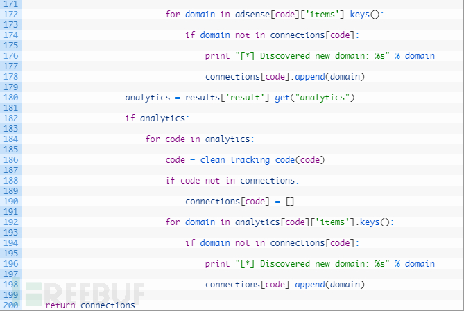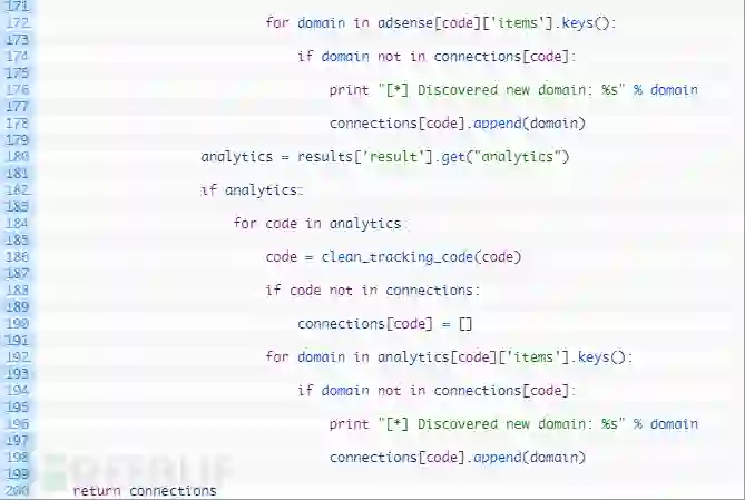 第172-178行:我们循环与Adsense代码相关联的域名(172行),如果还没有跟踪域名(174行),那么将其添加到我们的连接字典中,将其与当前跟踪代码相关联。