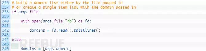这一小段代码很简单。如果我们收到一个文件名作为命令行参数,我们打开该文件,并逐行读取。如果没有,那么我们只需要脚本中传递的域名参数。