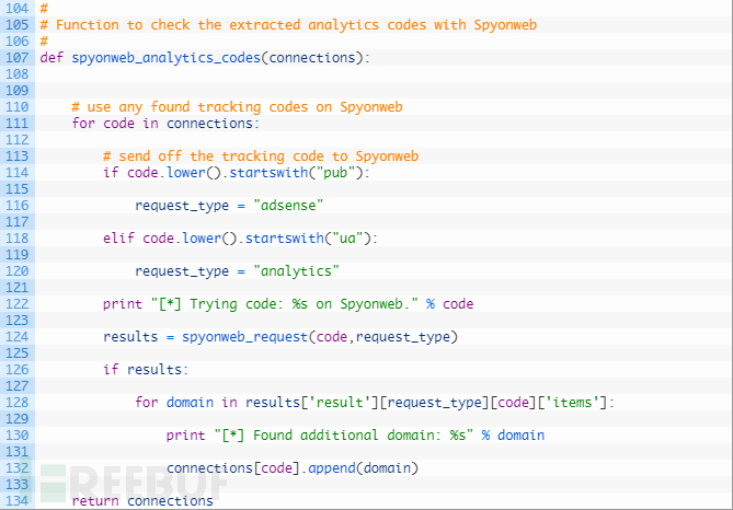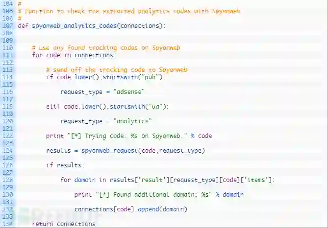 第126-134行:如果我们从Spyonweb获取到了有效的结果,那么就会循环遍历域名,并将其添加到与当前跟踪代码相关联的域列表中,完成后,返回更新后的字典。