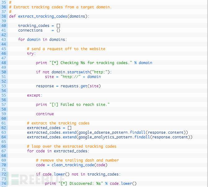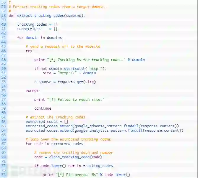 第38行:我们定义了extract_tracking_codes函数来接受我们要遍历的域名列表来执行提取。