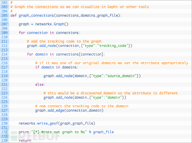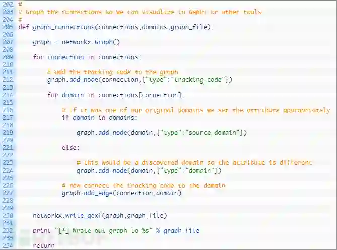 第230行:现在我们已经添加了所有跟踪代码和域名,并在它们之间绘制了一条线,之后只需使用write_gexf函数将图形写入文件即可。