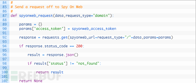 第89-90行:我们创建一个字典,其中包含Spyonweb的access token,它将在HTTP请求中传给Spyonweb。