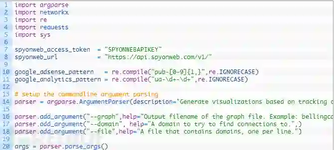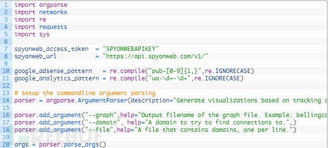 第13-20行:在这里我们设置命令行参数解析,以便轻松地传递一个域名,一个包含域名列表的文件,并允许为我们的图形输出指定的文件名。
