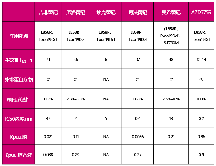 由于颅内特殊的解剖学结构——血脑屏障的存在,导致多数药物在颅内含量极低。临床前研究数据显示,第一、二代EGFR-TKI药物(吉非替尼、厄洛替尼、埃克替尼、阿法替尼)的血脑透过率较低在1.13%~3.3%之间,第三代EGFR-TKI奥希替尼血脑透过率为2.5%~16%。