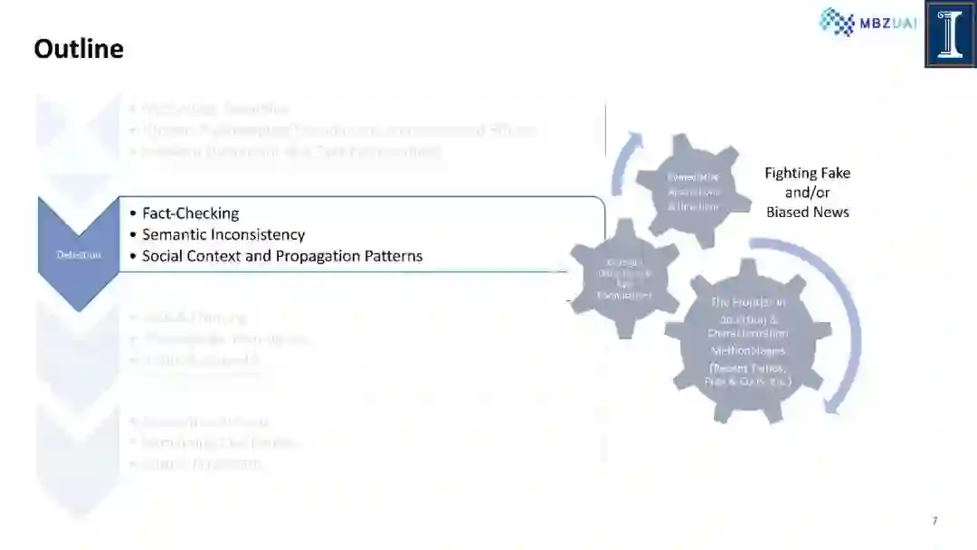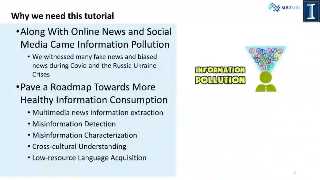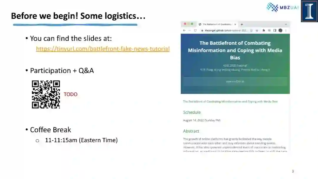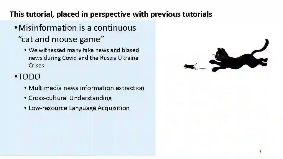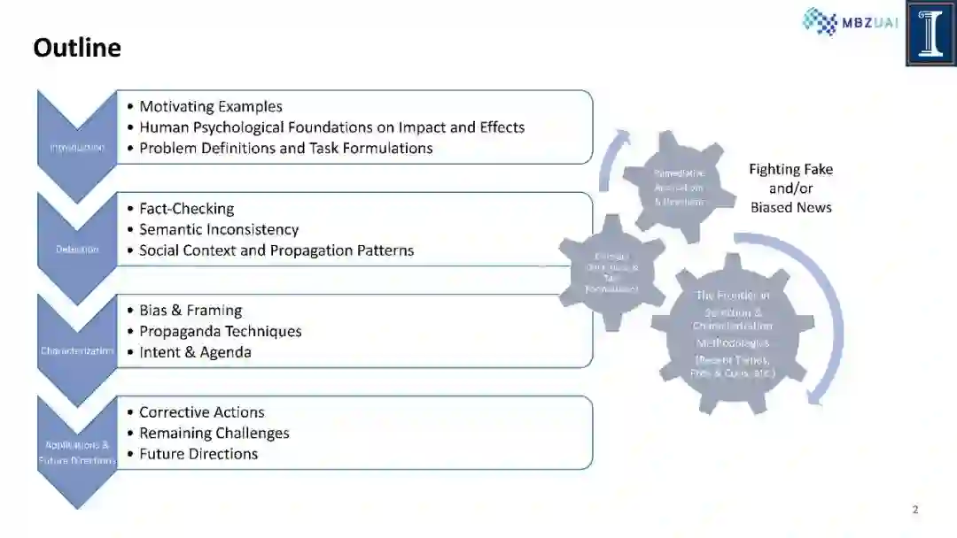 我们选择了一些真实世界的假新闻及其对社会的有害影响作为教程主题的开始,然后进行了一个教学练习,介绍人类如何处理假新闻的检测、表征和纠正问题。我们将指出各种类型的假新闻在概念上的区别,包括新闻新闻中对错误归因或不存在的事件的严重捏造,过度耸人听闻的点击诱饵,旨在被传统新闻网站转载的虚假新闻和模仿真实新闻但包含讽刺和荒谬的讽刺。例如,一般来说,新闻文章更有可能涉及严重的捏造,而社交媒体上的帖子则更多地涉及讽刺和恶作剧等幽默。我们还将描述导致人们形成或认可错误信息观点的认知、社会和情感因素(如直觉思维、虚假真相、来源线索、情绪等),以及错误信息被纠正后知识修正的心理障碍,包括纠正不整合、选择性检索和持续影响理论。