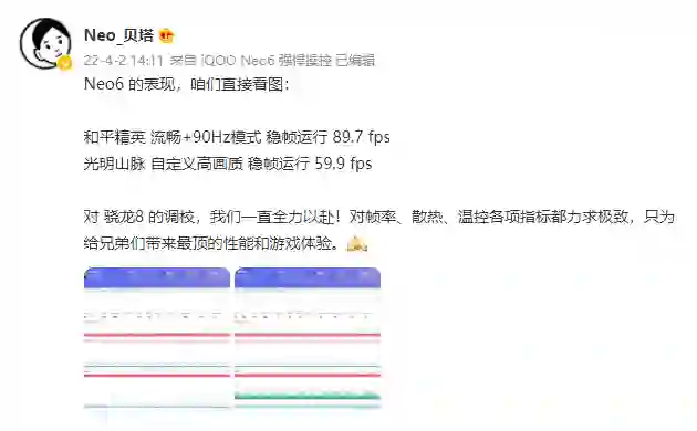 今天,iQOO Neo产品经理 @Neo_贝塔 晒出两张 Perfdog 测试截图,并认领了安兔兔官微抓取的 1065001 跑分 ,显示即将发布的 iQOO Neo6 将会有亮眼游戏稳帧表现的同时,保持高水平跑分。