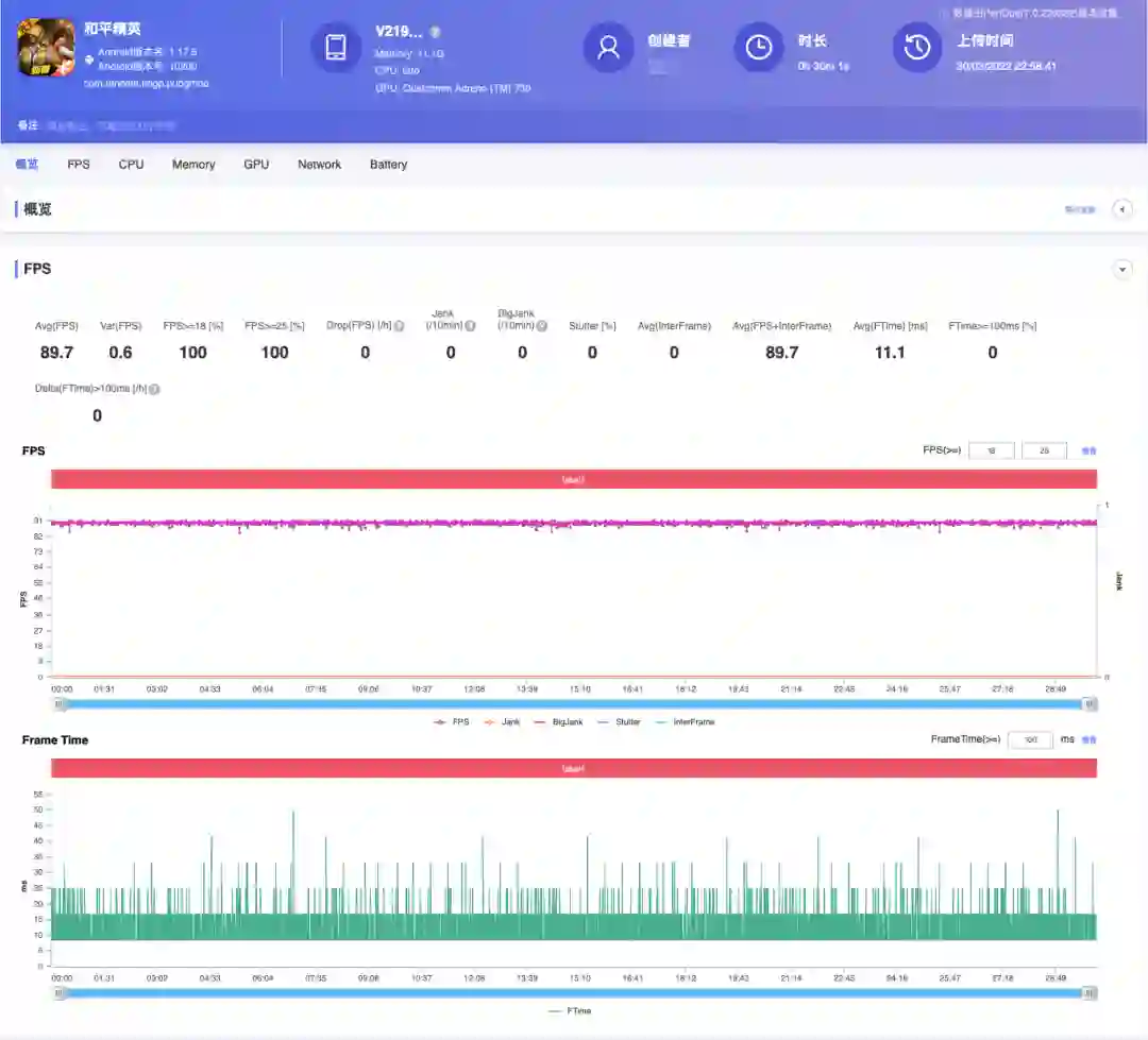 两张 Perfdog 测试截图分别为稳定在 60fps 左右运行的《光明山脉》以及稳定在 90fps 左右运行的《和平精英》。以《光明山脉》为例,这是一款重负载热门手游,十分考验手机的极限性能。iQOO Neo6 在自定义高画质模式下平均帧率可以达到 59.9fps,波动小、持续时间长。
