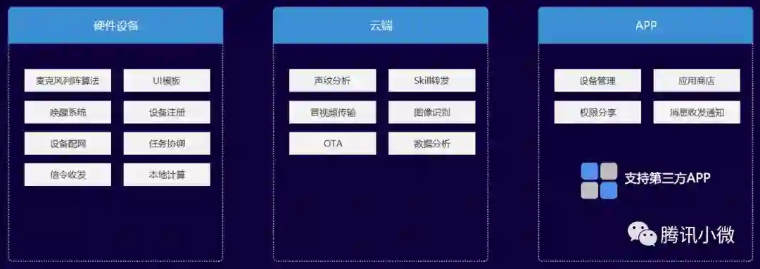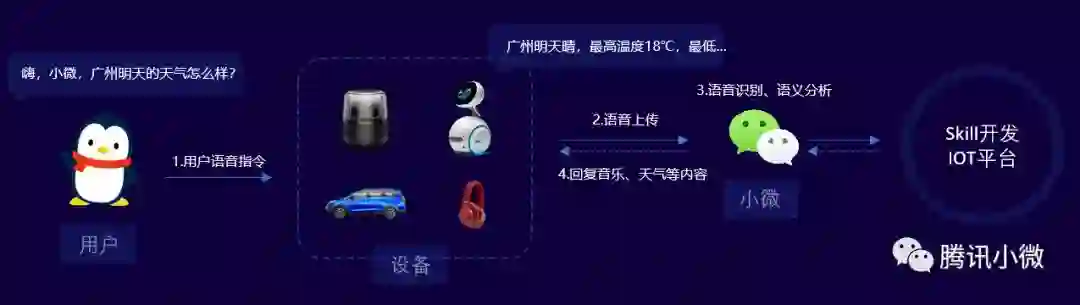 接⼊小微平台的设备可通过智能语音对话使用音乐、FM、新闻、视频和天气查询等内置技能,并通过开放技能平台创建配置自定义技能。小微不仅实现了传统硬件到智能硬件的升级,也在通过新的方式连接用户和微信生态下内容和服务。