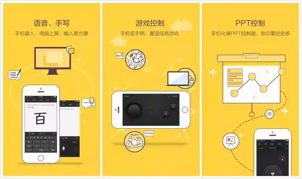 你可以把手机当成一个无线鼠标,而且它还有对应的左右键,触控板,单指控制光标,双指滚动屏幕,三指拖动窗口,基本上常用的操作都覆盖了。