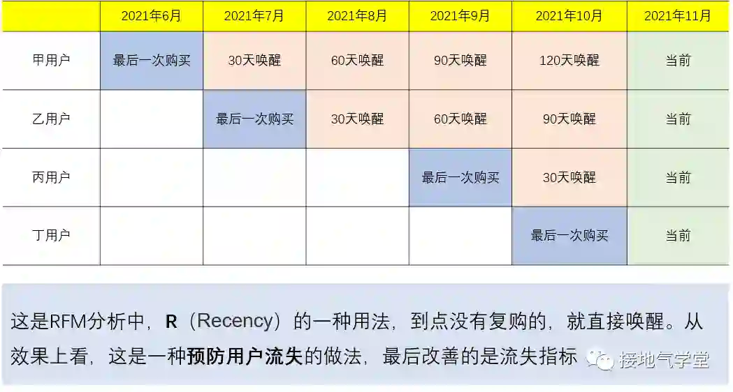 用户太久不来消费就可能流失,这个道理不用分析,是个人都知道。因此衍生了一个做法:计算用户最近一次消费距今时间,如果发现用户已经距今7天/30天/60天/90天没有复购,则直接开展唤醒动作,优惠券发起来!