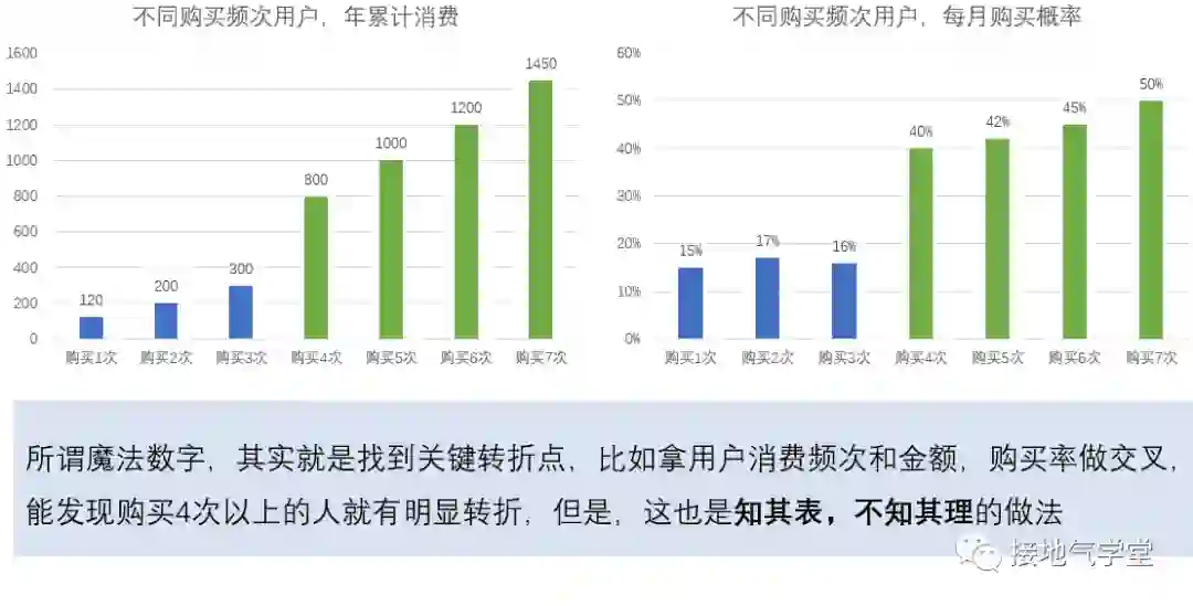比如发现用户复购4次以后,再进行复购的概率与累计消费都明显高于其他用户。运营便很有动力围绕这个“4次”做文章,通过会员奖励/连续推券/积分等手段,鼓励用户做到这个“4次复购”。