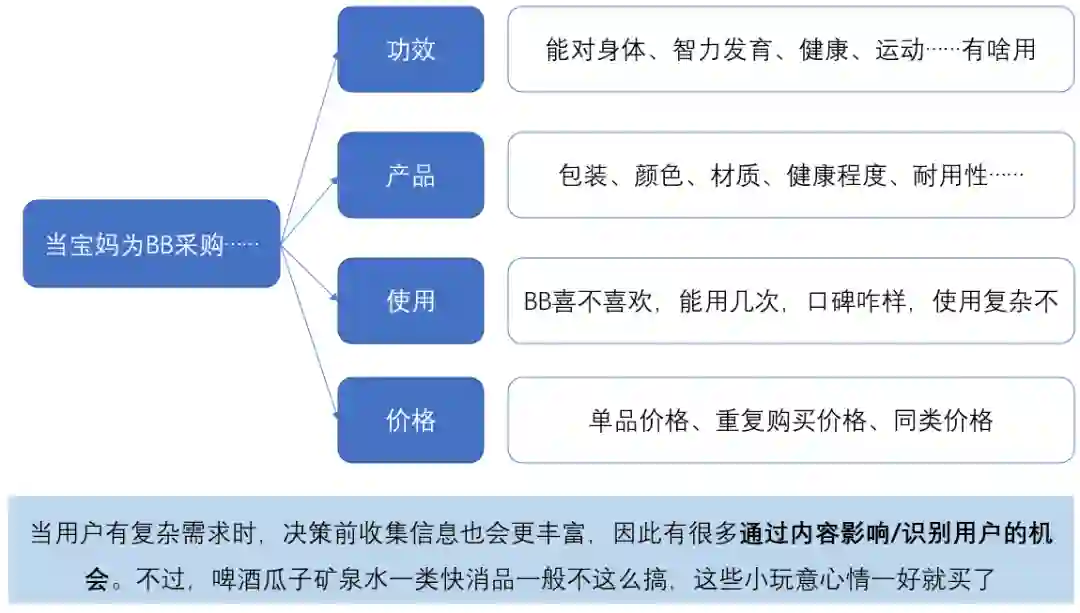 所谓一站式服务,本质上源于用户的复杂需求。比如同样是买椅子,如果是给自己租的房子配椅子,可能2把就够了。如果是给自己新房子买椅子,藏在椅子背后的需求是整个房子的家具。类似的,给小朋友买玩具,可能对应着书、衣服、鞋子、辅食……