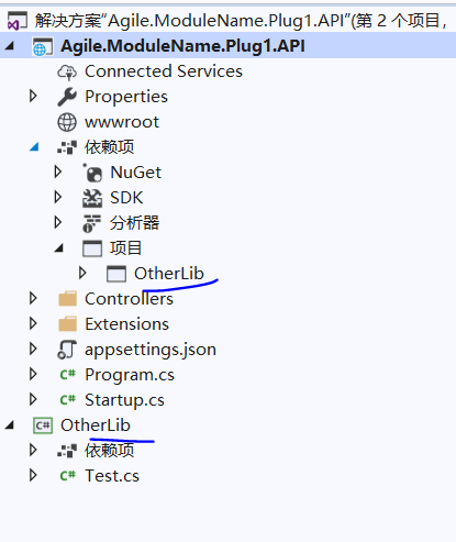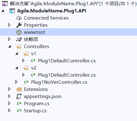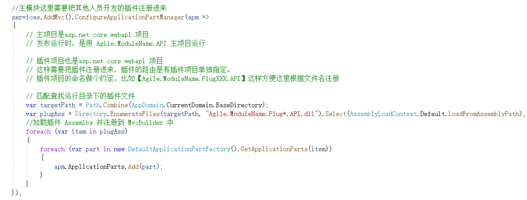 每个独立开发的都是vs里面建立的标准ASP.NET Core WebAPI项目,这里主项目和各个插件项目没有从属关系,完全平等API项目开发,最后只是可以汇合到主项目作为一个站点发布交付。各自独立调试运行各自开发功能模块,测试没问题发布汇总到主项目,部署运行,之后哪个接口问题只需要找到对应的模块修改,完全隔离开,不用担心修改会影响其他正常使用的模块。