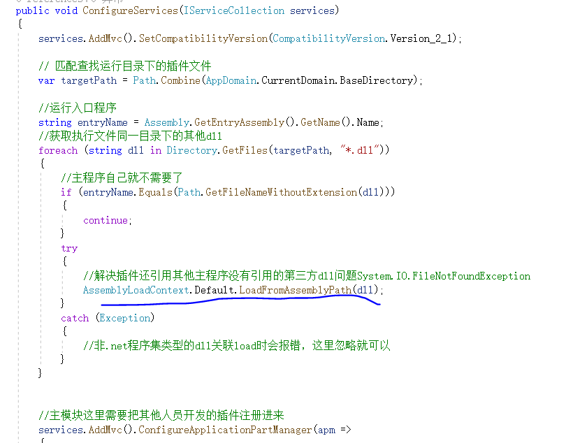 汗,居然报错了,提示FileNotFoundException,但是看上面的错误信息截图提示找不到OtherLib.dll文件。OtherLib.dll这个文件明明在这个目录有的。查了相关资料都说是.net core的加载机制变了,但还是没理解透彻,不知道.net core3.0会不会解决这个问题。希望有大神看到可以解惑下这个问题。不过这里我使用一种方式可以解决这个报错,在主程序这里加这段代码。在注册插件项目之前,遍历所有dll,做一次加载就可以了。如图20