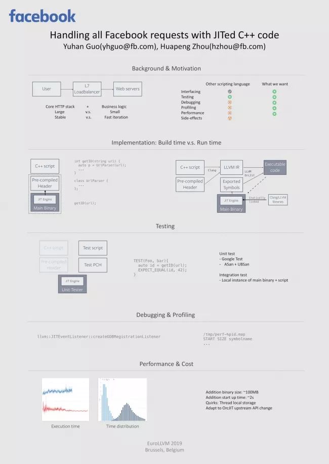 如前边的图片所示,“Handling all Facebook requests with JITed C++ code”,所有 HTTP 请求都使用 JIT 过的 C++ 处理,C++ 脚本在运行时编译、链接与执行,并由 LLVM/Clang 构建。与其它脚本语言相比,这提供了更好的调试、性能分析和最终的运行时性能。
