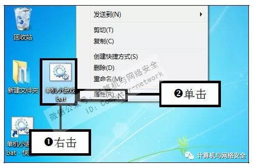 步骤8:单击“属性”命令,此时可在桌面上看见创建的快捷方式,为了隐藏创建的文件,需要右击该文件图标,在弹出的快捷菜单中单击“属性”命令。