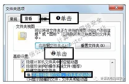 步骤9:不显示隐藏的文件和文件夹,弹出“文件夹选项”对话框,切换至“查看”选项卡,在“高级设置”列表框中单击选中“不显示隐藏的文件、文件夹或驱动器”单选按钮。
