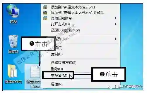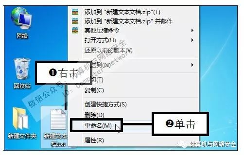 步骤4:单击“重命名”命令,右击新建的文本文档图标,在弹出的快捷菜单中单击“重命名”命令。