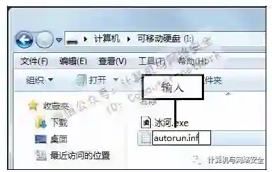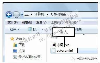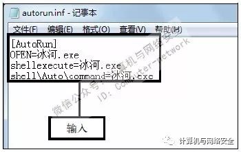 步骤5:输入代码,打开重命名后的autorun.inf文件,在编辑区中输入如上图所示的代码,使得用户在双击U盘后自动运行“冰河”木马服务端程序。