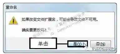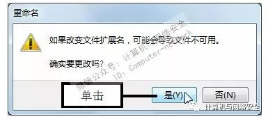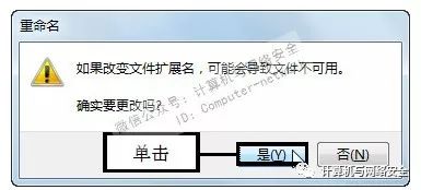 步骤6:单击“是”按钮,按【Enter】键后弹出“重命名”对话框,提示用户如果改变文件扩展名,可能会导致文件不可用,单击“是”按钮确定更改。
