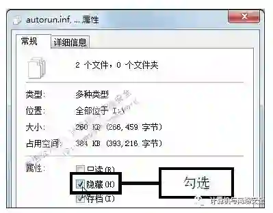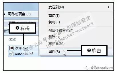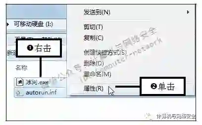 步骤6:单击“属性”命令,选中木马程序和autorun.inf文件,右击任意选中的文件,在弹出的快捷菜单中单击“属性”命令。