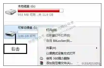 步骤1:查看快捷菜单,将U盘接入计算机,打开“计算机”窗口,右击“可移动硬盘”图标,在弹出的快捷菜单中可看见第一个命令为“打开”命令。