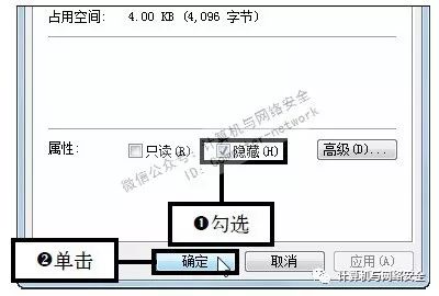 步骤7:勾选“隐藏”复选框,弹出属性对话框,在“属性”选项组中勾选“隐藏”复选框。