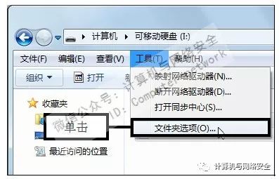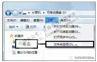 步骤8:单击“文件夹选项”命令,返回U盘窗口中,在菜单栏中依次单击“工具>文件夹选项”命令。