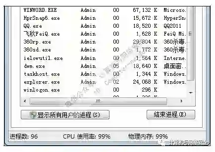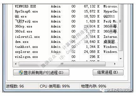 有些病毒一旦运行,将会导致计算机运行速度变慢,打开“任务管理器”窗口后可以看见进程的数量比正常情况下要多,并且CPU的使用率一直保持接近于100%,如下图所示,另外,主机箱上的硬盘指示灯在没有操作的情况下会长时间地闪动。
