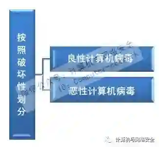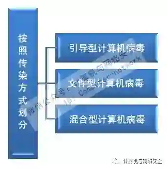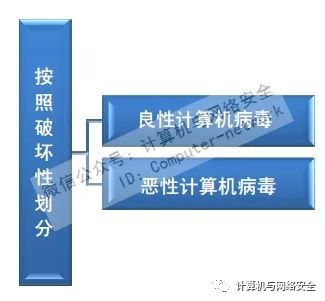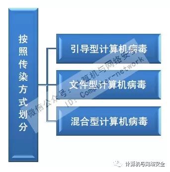 按照传染方式可划分为引导型、文件型和混合型计算机病毒;按照破坏性可划分为良性与恶性计算机病毒;按照链接方式可划分为源码型、嵌入型、外壳型和操作系统型计算机病毒。