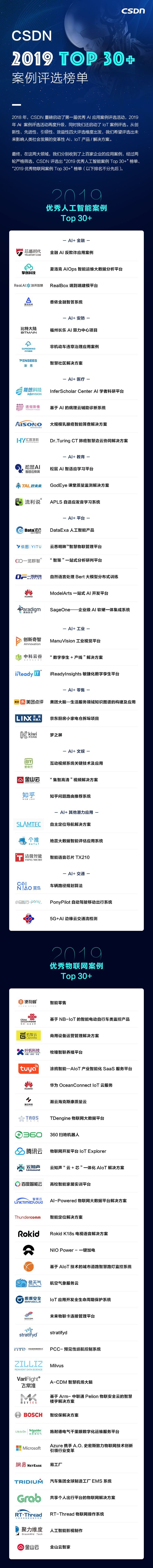 最终,在这两大领域,我们分别收到了上百家企业的应用案例,经过两轮严格筛选,CSDN 评选出“2019 优秀人工智能案例 TOP 30+”榜单、“2019 优秀物联网案例 TOP 30+”榜单(以下排名不分先后)。