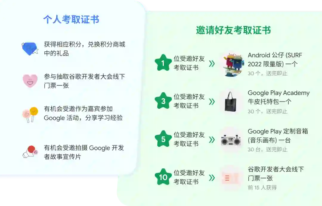 我们希望此次活动能够助力您实现自我提升和能力进阶,并且期待和您更深入地交流,特别为获得证书的开发者争取到即将在 9 月举办的 "谷歌开发者大会" 线下门票、Google 市场活动特邀嘉宾身份等奖励,并真诚期待能和您在未来的活动中见面。考取证书上传至活动页面并通过审核,即可获得: