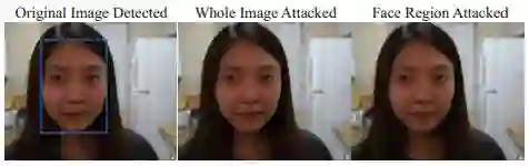 图3:修改人脸图像以成功地攻击Faster RCNN。在原人脸图像(第一个)中,人脸被可靠地检测到。第二个图像,在整个图像中加入小的干扰,人脸没有被检测出来。最后一个图像,更大的干扰被添加到脸部区域而不是整个图像中,人脸没有被检测到。