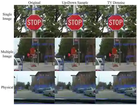 图10:将简单的防御[ 11 ]应用于关于Faster RCNN的对抗样本生成。对图像均值和分辨率进行一般的下采样,然后上采样到原始分辨率。TV噪声就是对图像进行全变化正则化去噪,去除高频信息,保持低频信息。在第一行中,通过简单的图像处理就能检测出具有小干扰的单个图像产生的对抗样本。在第二行,在简单的防御之后仍然无法检测到来自多重视角条件的对抗样本。在最后一行,在简单防御后仍然无法检测到具有物理对抗性的停止标志。