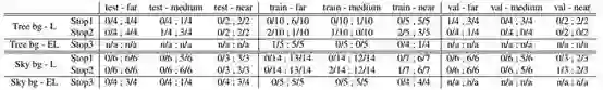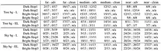 表1:本表报告了停止标志多图像数字攻击的Faster RCNN和YOLO检测率。每个单元格中,分号前的比例代表Faster RCNN的检测率,分号后的比率代表YOLO的检测率。Tree bg表示停止标志的背景是树并且具有低对比度,Sky bg意味着停止标志的背景是天空并且具有高对比度。L后面的意思是扰动很大,而EL意味着扰动非常大。我们有三个黑色的停车标志,在训练/评估/测试的三个不同距离(远/中/近)计算的准确率。我们可以用多重视角条件攻击FasterRCNN,对抗性干扰可以推广到新的视角条件。对抗样本也可以推广到YOLO,特别是当背景是树时。
