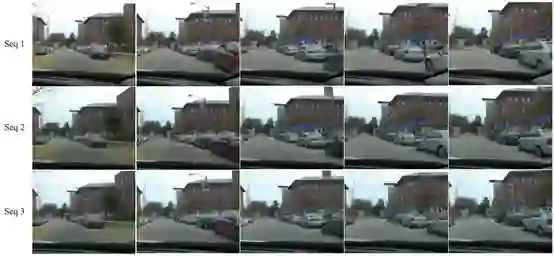 图7:我们从图6中打印出三个对抗的停止标志,并将它们贴在一个真正的停止标志上。我们在开车的时候拍了打印的停止标志的视频,在这些视频中运行Fastere RCNN。注意,所有的对抗性干扰都是在数字化的情况下进行的。我们只对检测结果中的停止标志进行着色,以使图片数据更干净。这个图中的三个序列顺序对应于三个停止标志。在前两个序列中,停止标志可以被检测到,而在最后一个序列中,视频中的停止标志没有被检测到,所以它是一个物理上的对抗性停止标志。这可能是由于纹理对比度差异的结果,即使这个序列在训练中是不可见的。